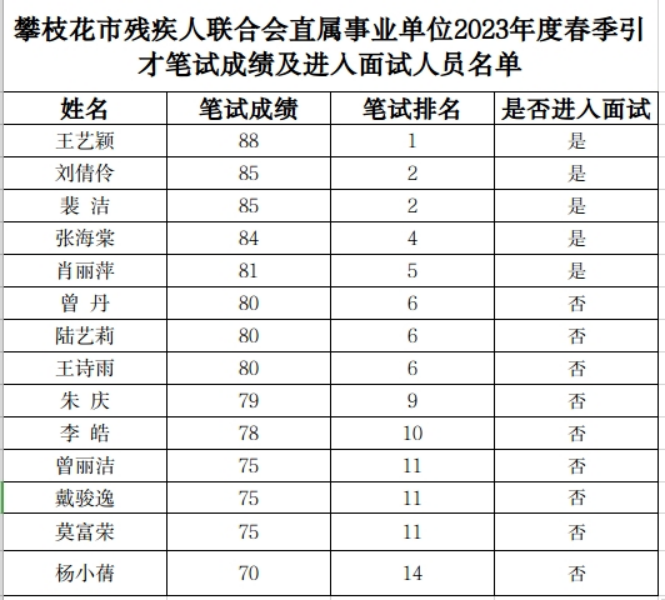 根據(jù)《2023年攀枝花市事業(yè)單位春季引才公告》、《攀枝花市殘疾人聯(lián)合會關于2023年春季引才考核工作的公告》和《攀枝花市殘疾人聯(lián)合會關于直屬事業(yè)單位2023年春季引才筆試考核工作的通知》,攀枝花市殘疾人聯(lián)合會直屬事業(yè)單位—攀枝花市殘疾人康復教育中心康復訓練師崗位招聘1人,通過智聯(lián)招聘網(wǎng)絡報考我會并通過資格復審的考生共29人。在4月16日舉行的線下筆試中,實際參加考試的考生共14人。現(xiàn)將筆試成績及排名情況公布如下:
