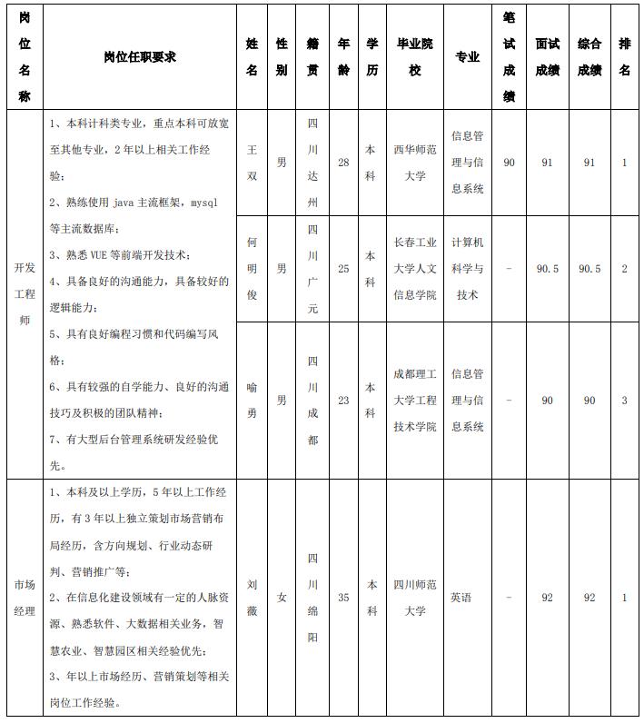 根據(jù)成都九洲電子信息系統(tǒng)股份有限公司發(fā)布的招聘公告及招聘相關(guān)規(guī)定,經(jīng)筆試、面試等程序,現(xiàn)將筆試、面試成績予以公示。